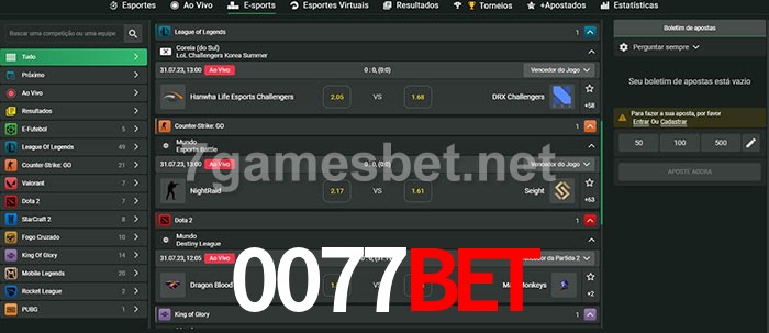 O 0077Bet oferece uma grande seleção de opções de apostas em e-sports com probabilidades competitivas